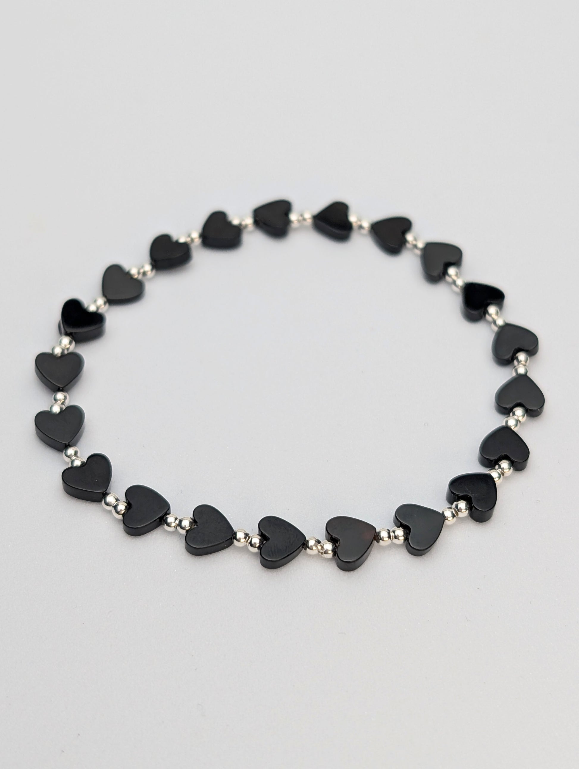 This beautiful bracelet features smooth 5mm black onyx heart beads, elegantly accented with 2mm sterling silver beads.
