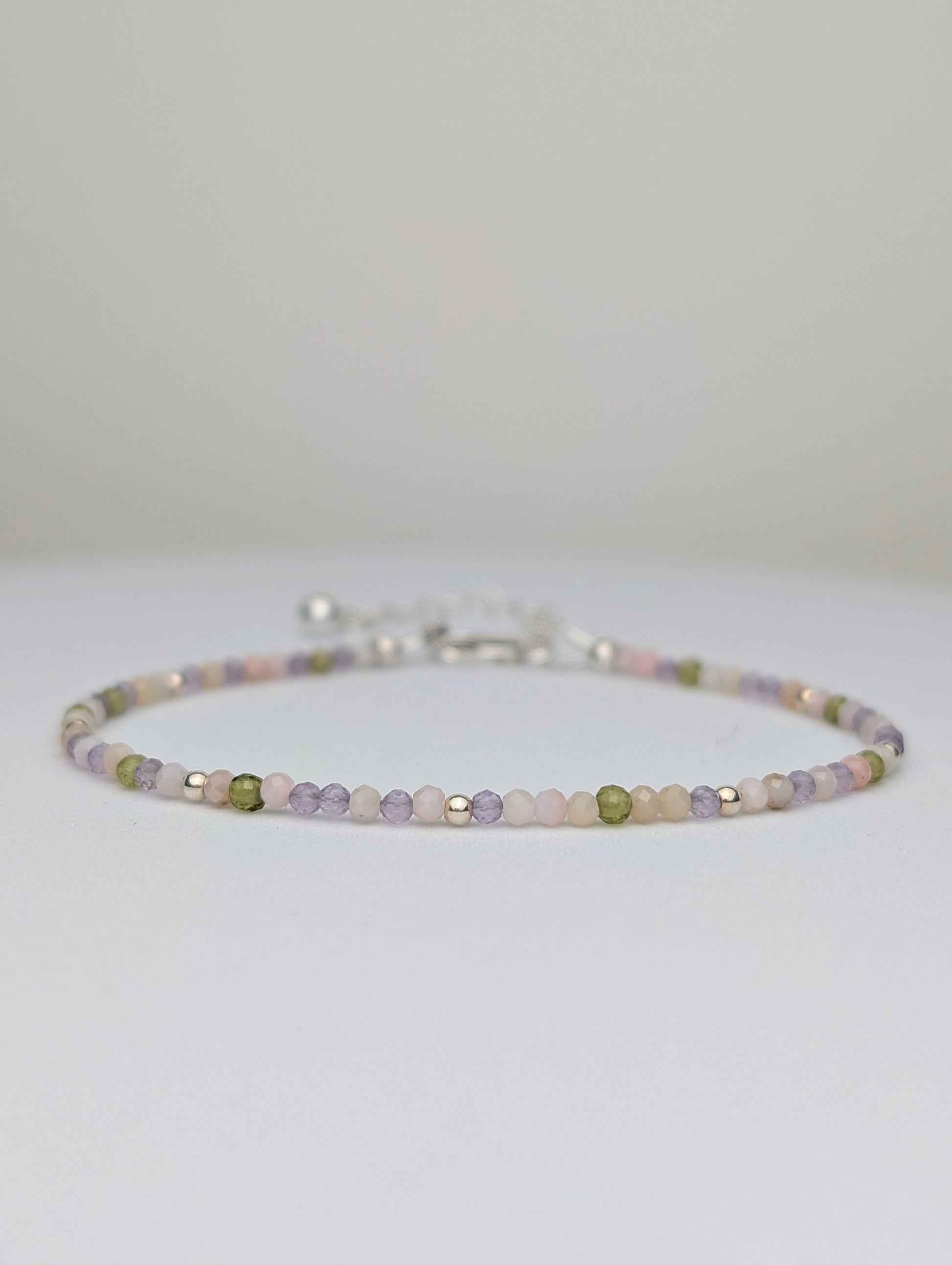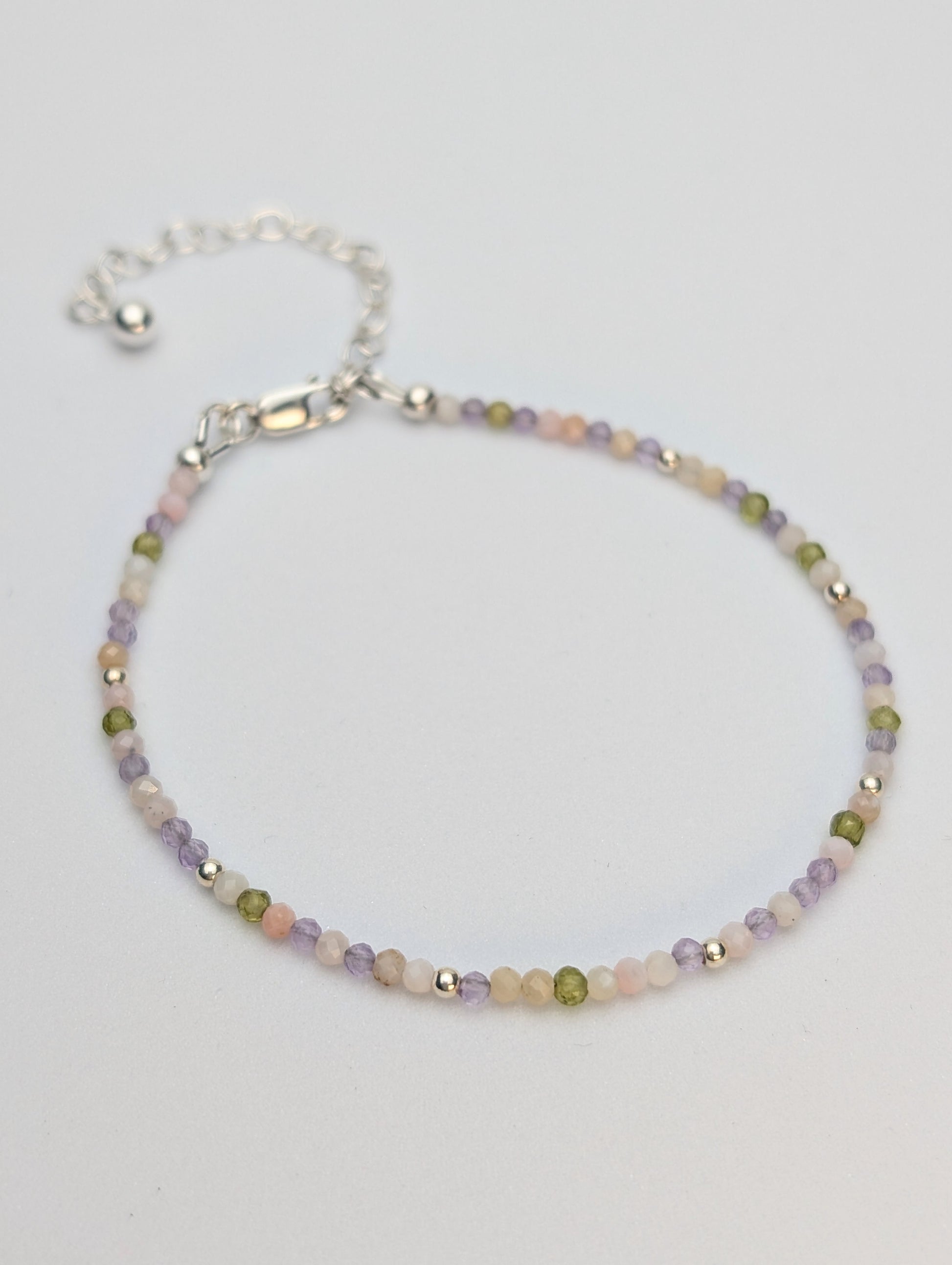 This dainty gemstone fairy bracelet is handmade with a stunning blend of 2mm gemstone beads (green vesuvianite, pink opal and lilac amethyst), combined with sterling silver beads for extra sparkle.