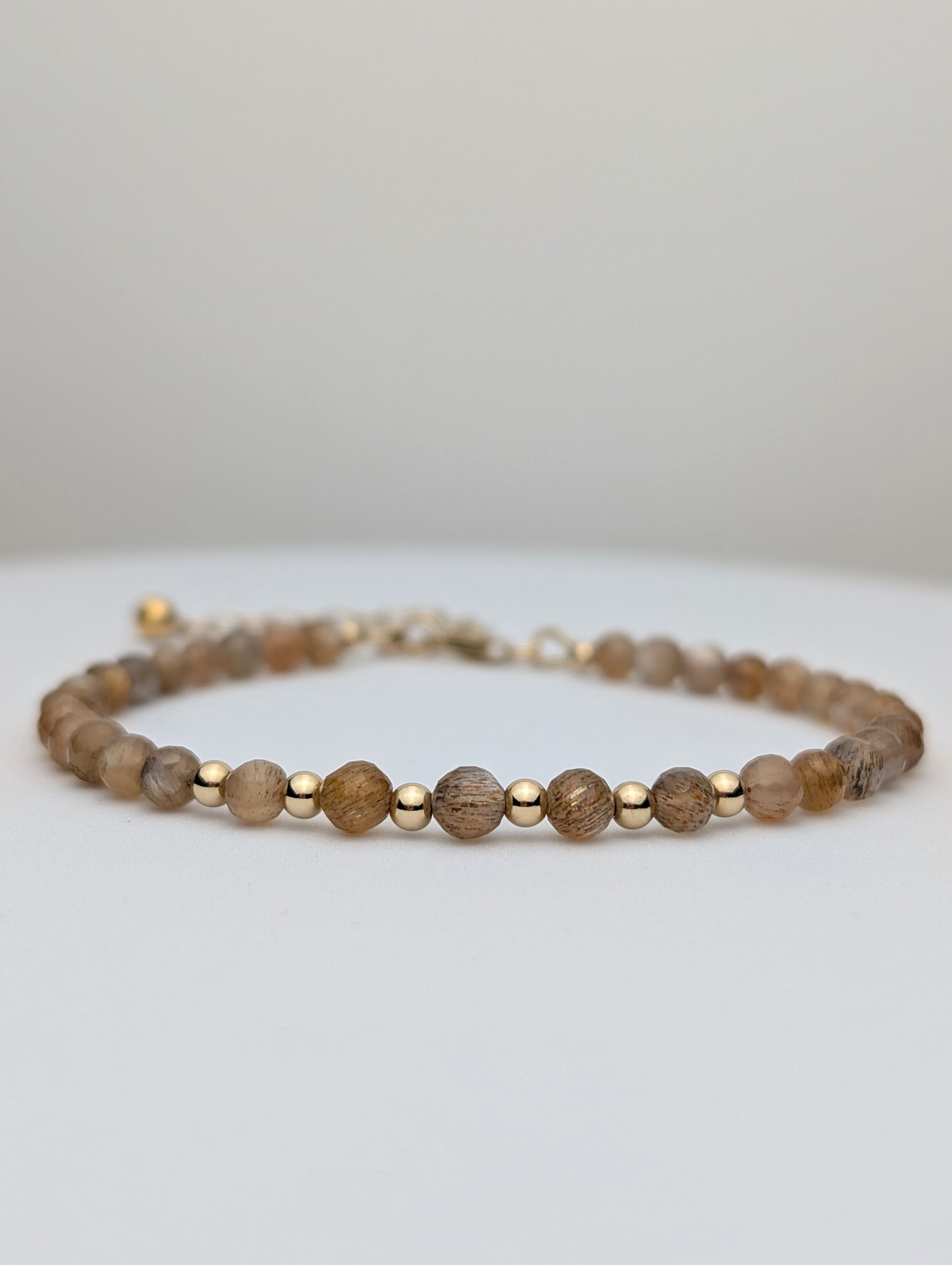 Add a soft glow to your look with this golden moonstone and 14K gold filled beaded bracelet. Golden moonstone is known as a stone of intuition, inspiration and inner balance.