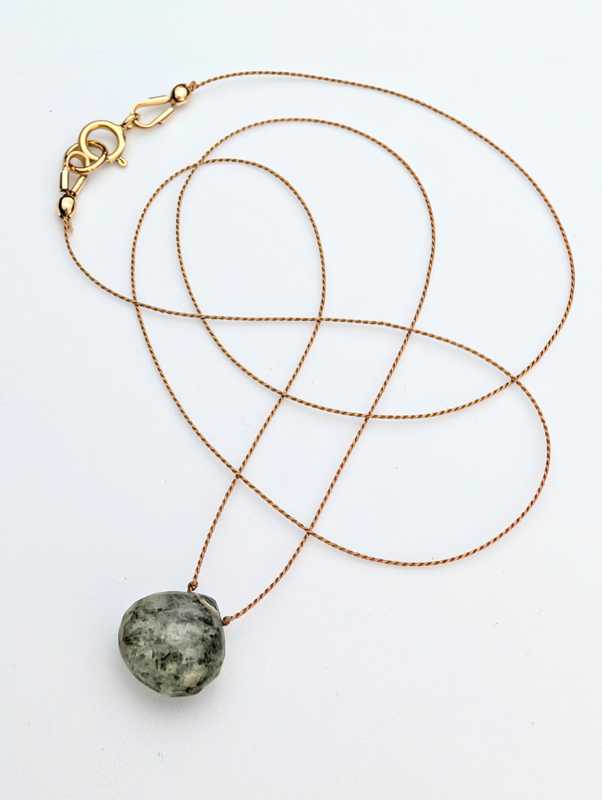 Materials: Moss Quartz, 14K gold filled findings and natural silk cord.