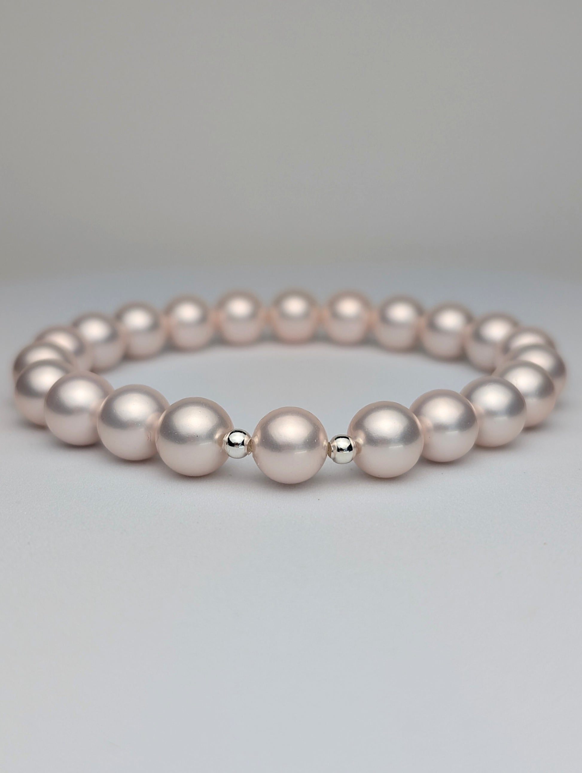 This beautiful pink Japanese shell pearl and sterling silver beaded bracelet features luminous 8mm shell pearls, accented with 3mm sterling silver beads.