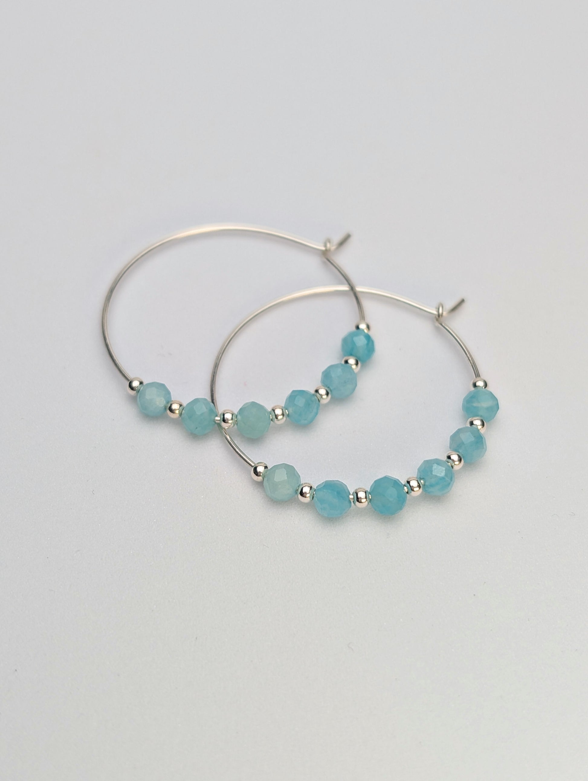 These beautiful sterling silver hoop earrings feature 4mm amazonite gemstone beads paired with 2mm sterling silver beads. Amazonite is often associated with harmony, truth and communication, believed to bring soothing energy that calms the spirit, balances emotions and inspires confidence in self-expression.