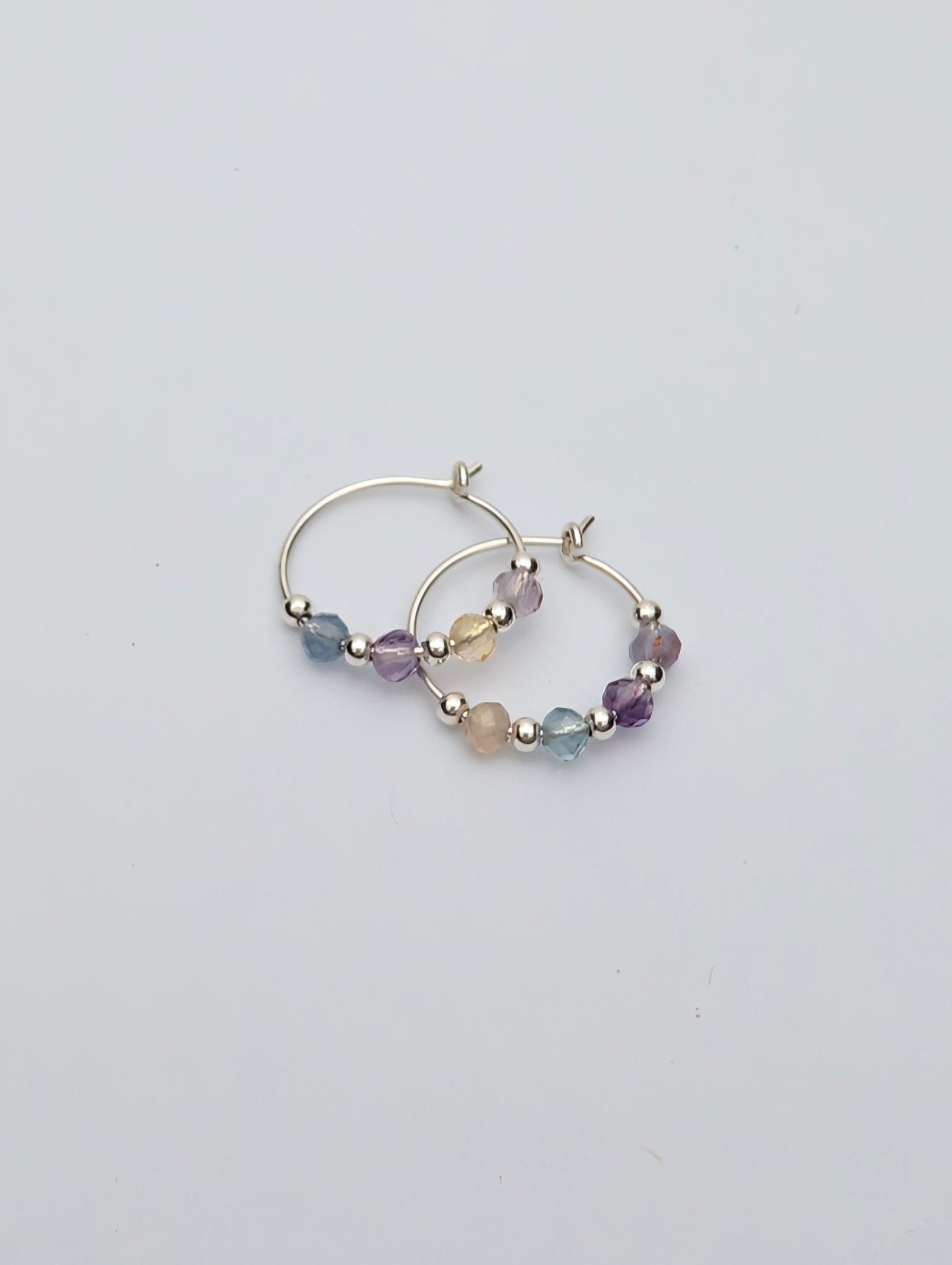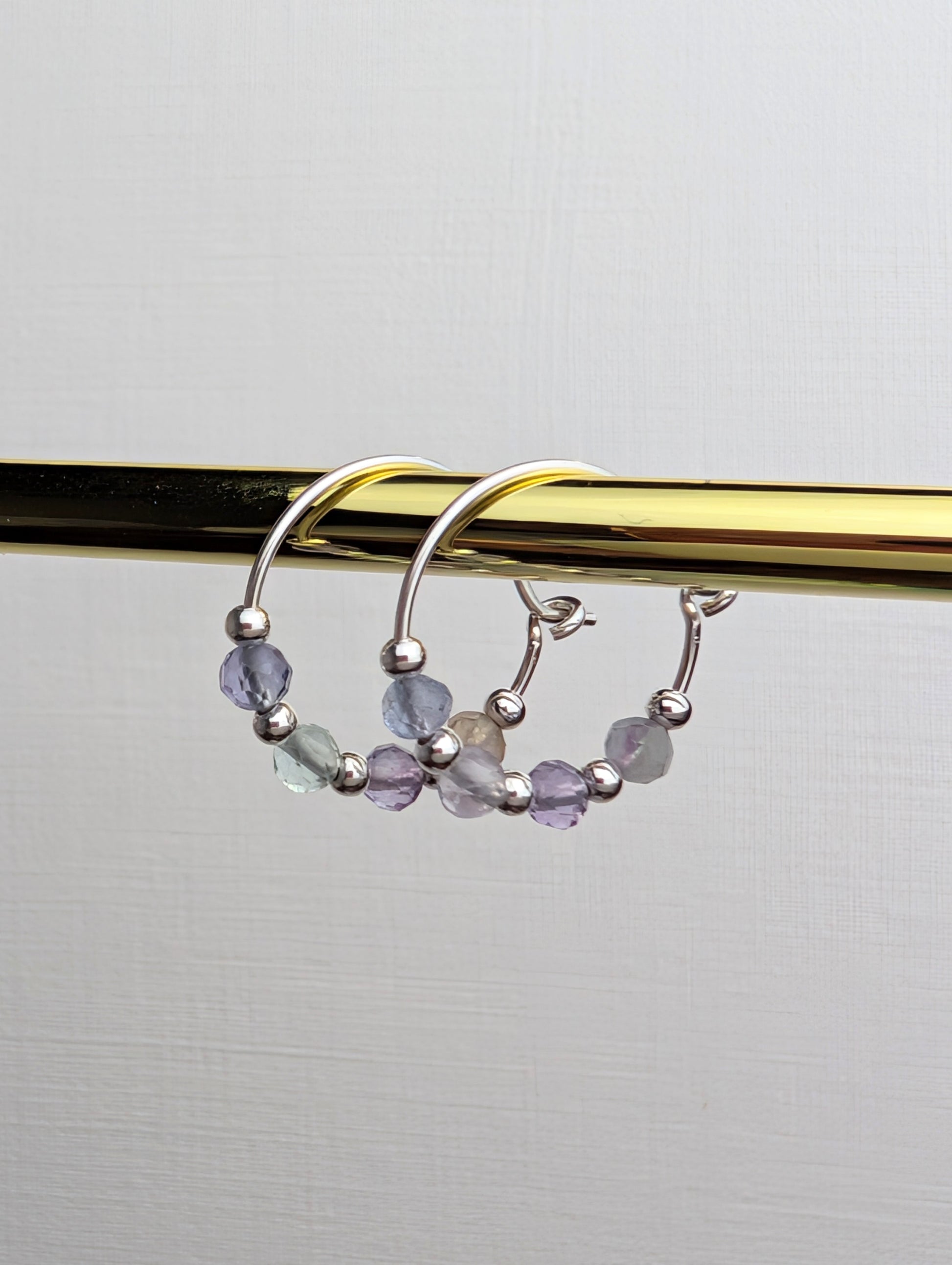 These beautiful sterling silver hoop earrings feature 3.25mm fluorite gemstone beads paired with 2mm sterling silver beads. Fluorite is often associated with clarity, focus and balance, believed to bring calming energy that clears the mind, encourages positivity and supports decision-making.