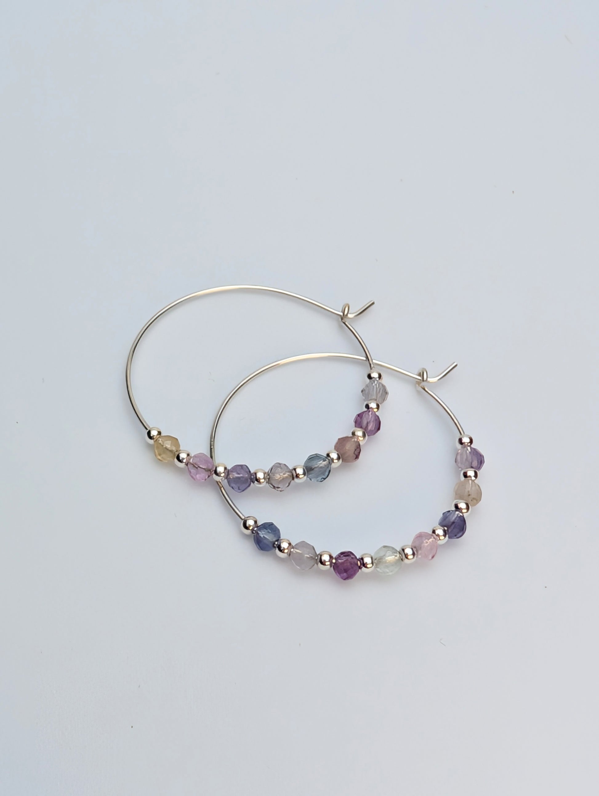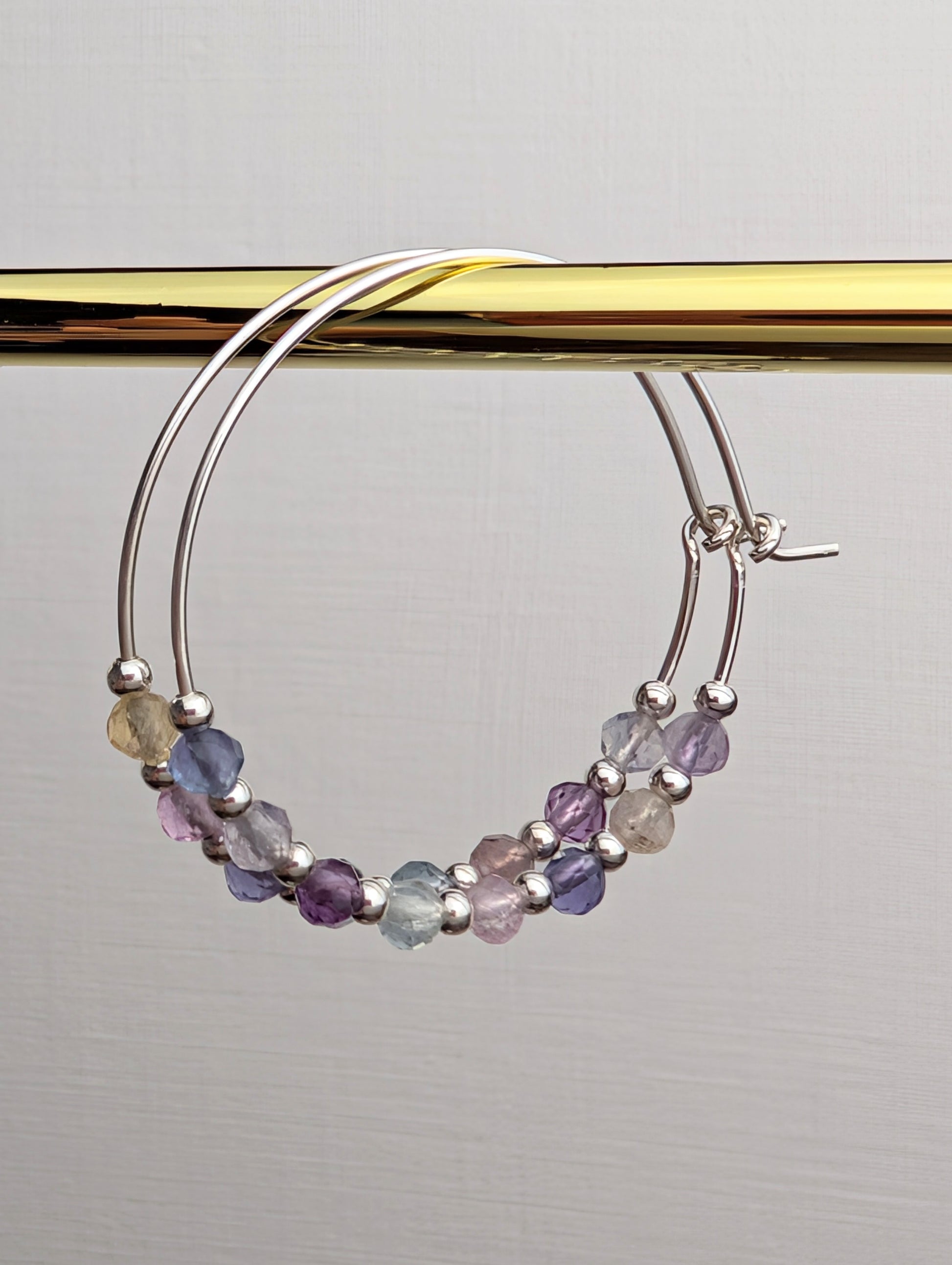 These beautiful sterling silver hoop earrings feature 3.25mm fluorite gemstone beads paired with 2mm sterling silver beads. Fluorite is often associated with clarity, focus and balance, believed to bring calming energy that clears the mind, encourages positivity and supports decision-making.